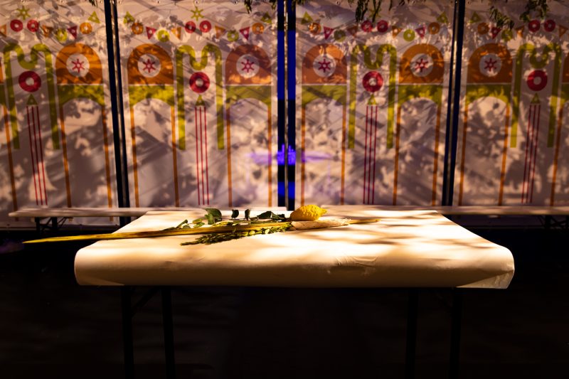 “Sukkot” is the plural of “Sukkah”: a hut, tent or other temporary dwelling. In the mythical narrative, the term refers to the huts in which the Israelites slept during their journey through the desert after departing from Egypt. The main tradition of this holiday is hosting: A Sukkah is built to live in for a week. In it, one invites friends, family members and strangers to gather. for “the high holidays of 5786”, a sukkah will be built in the Sophiensæle Festsaal. The events during this week will focus on artists who consider hosting as a central principle in their work. The sukkah thus becomes the setting for an unfolding of knowledge exchange and conversation. The gatherings take on very different forms: part workshop, part hangout, talk, concert and party. Everything remains in motion: Guests become hosts and hosts become guests in a constantly changing negotiation.